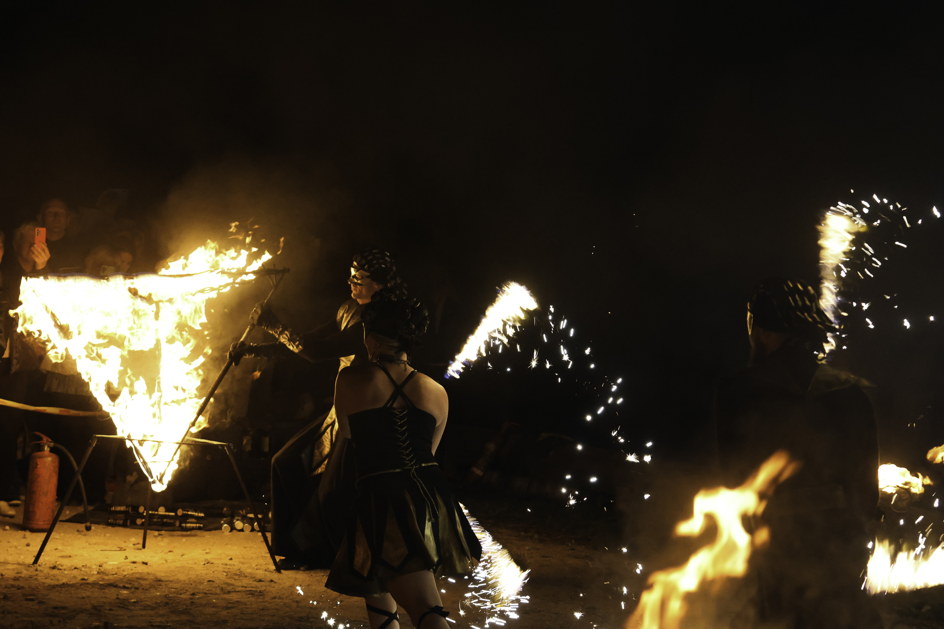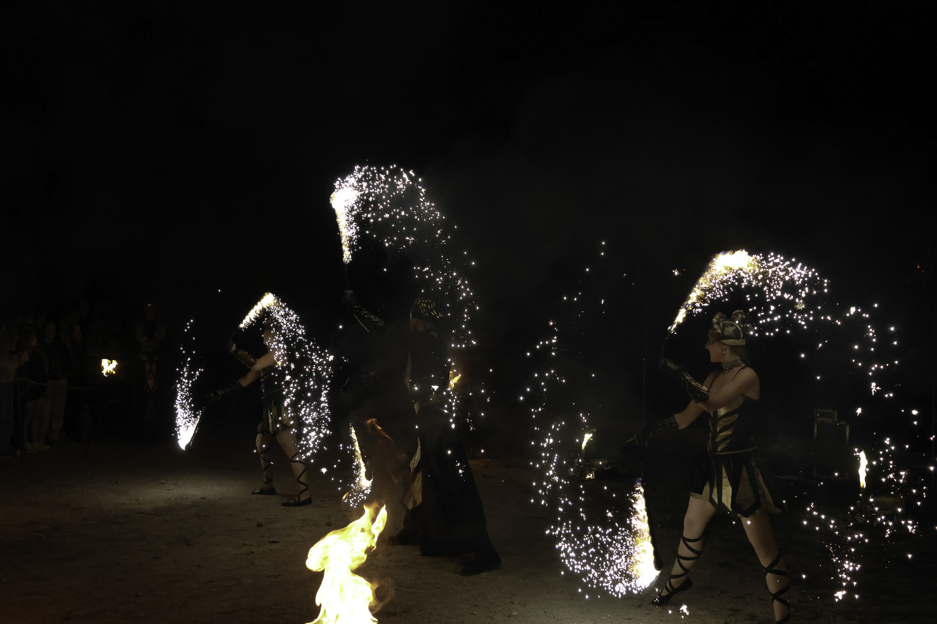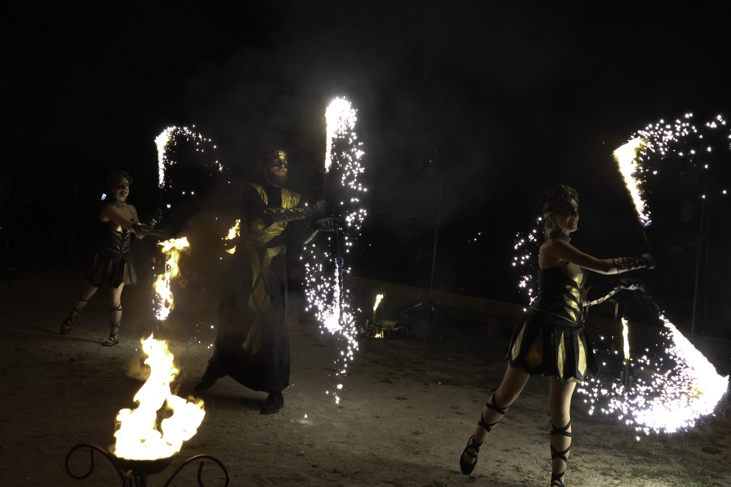 Ugnies šou su trimis atlikėjais, demonstruojančiais ugnies efektus.