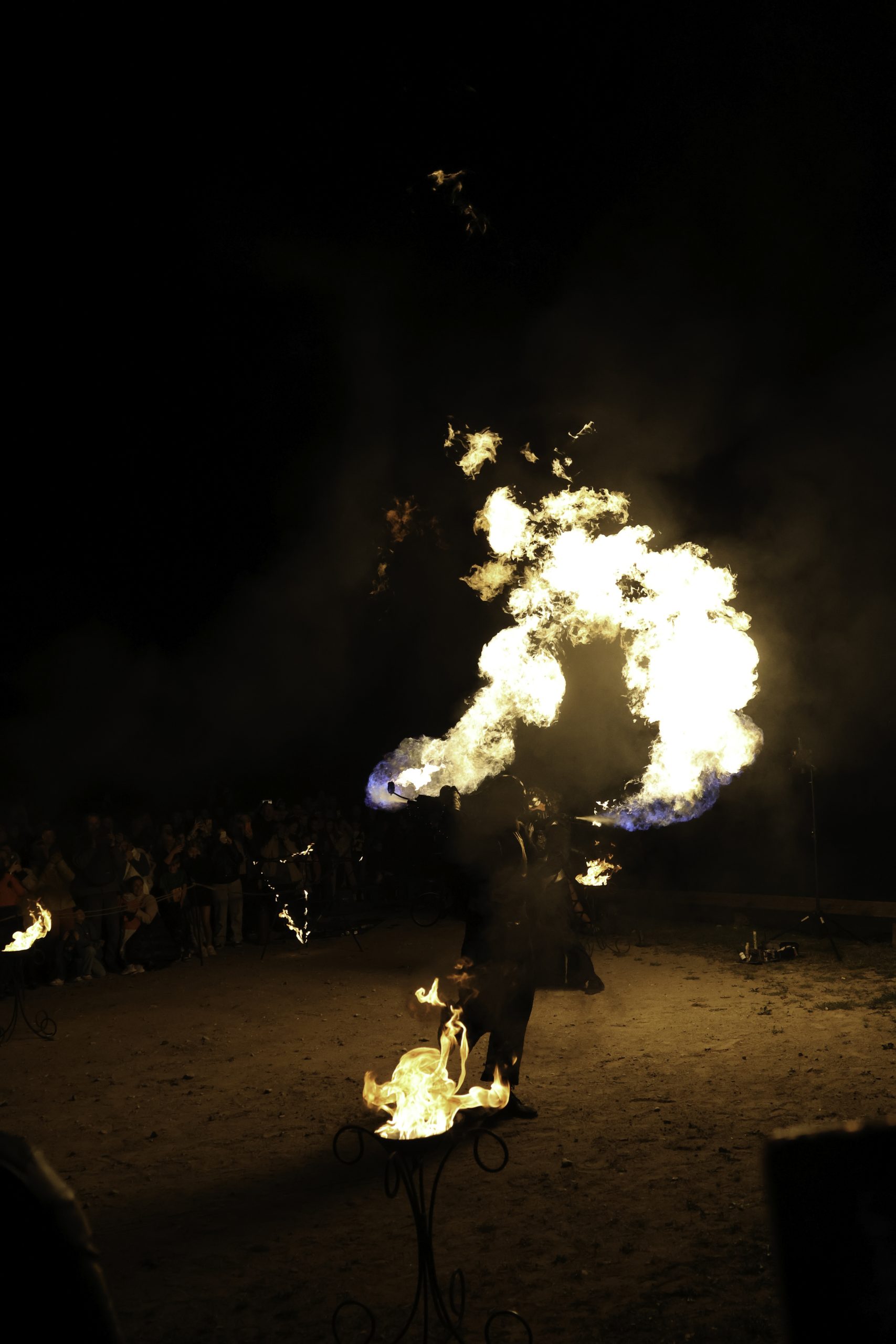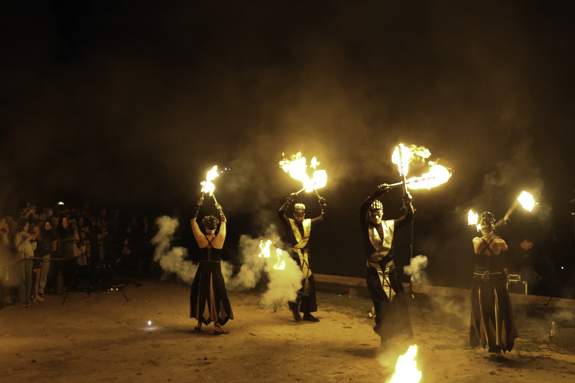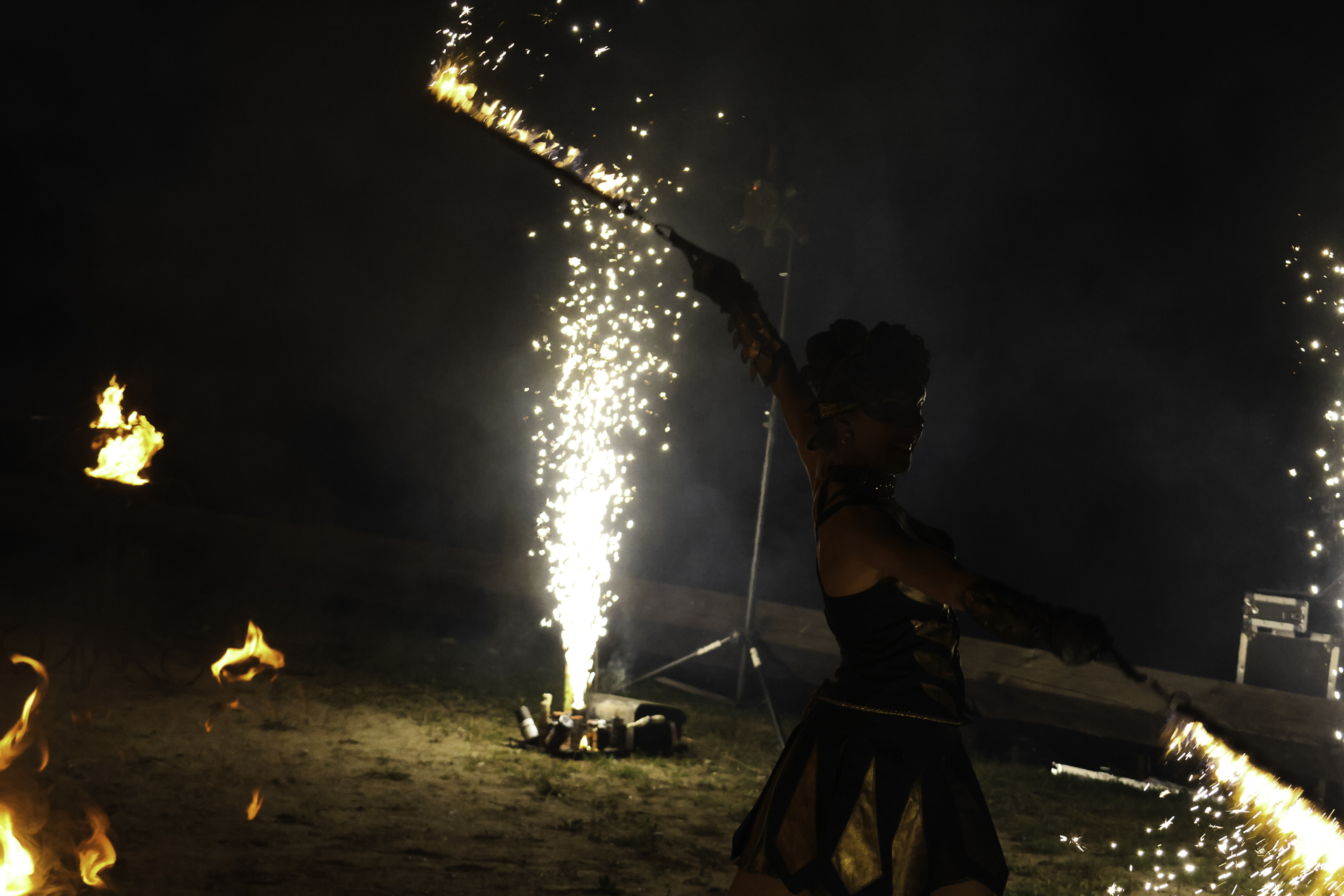Ugnies šou su trimis atlikėjais, demonstruojančiais ugnies efektus.