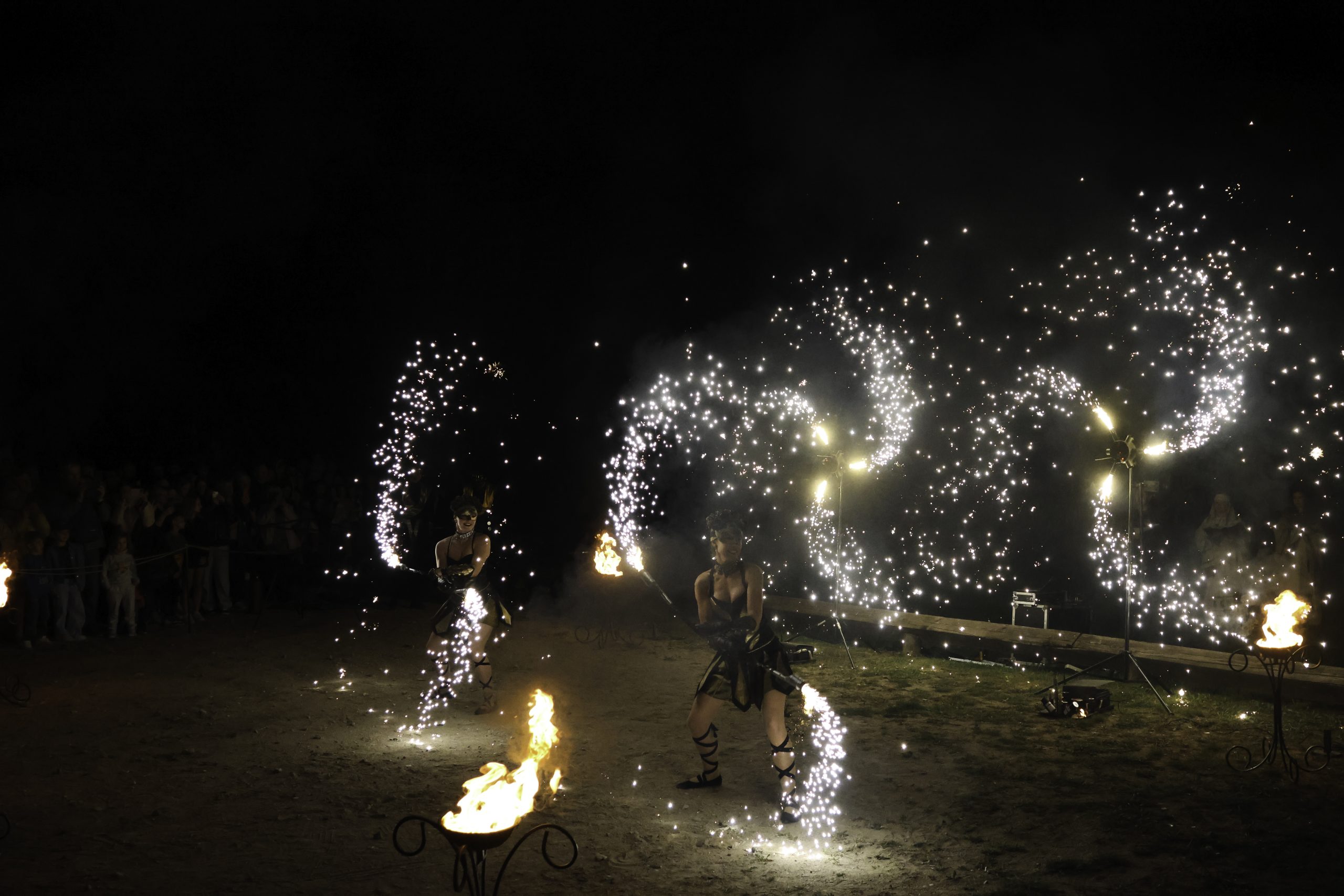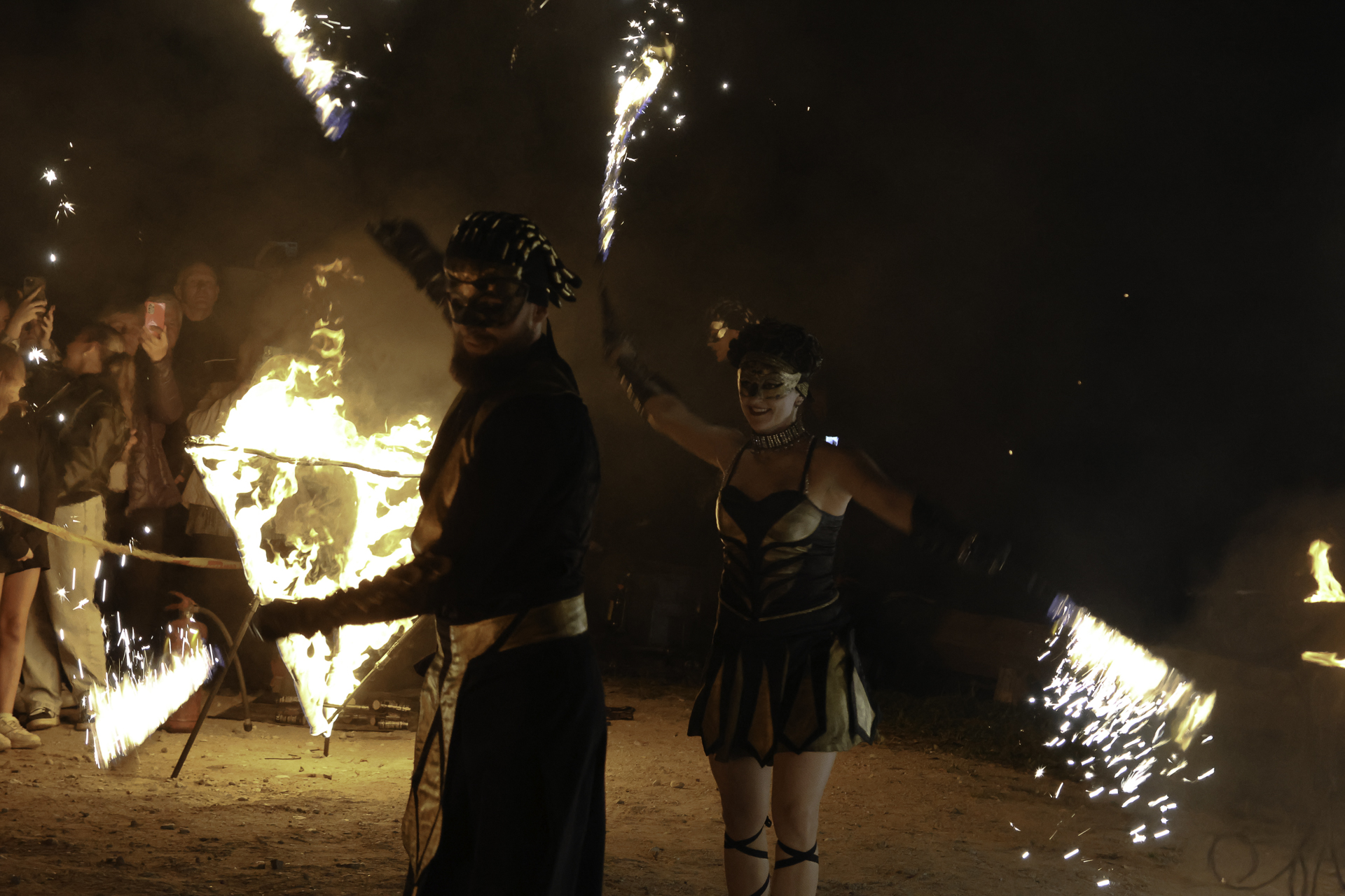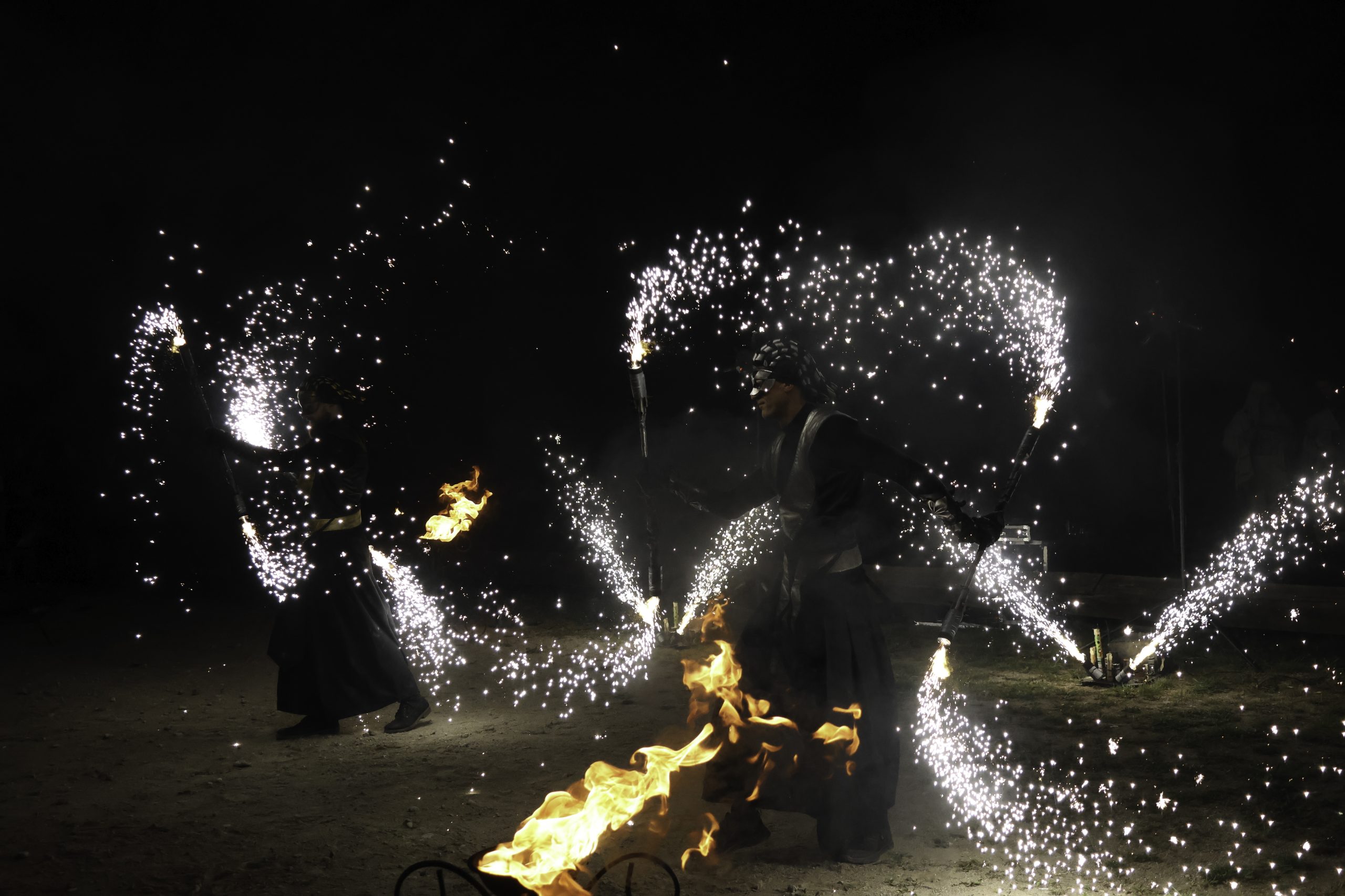 Dvi figūros atlieka ugnies šou su fejerverkais.