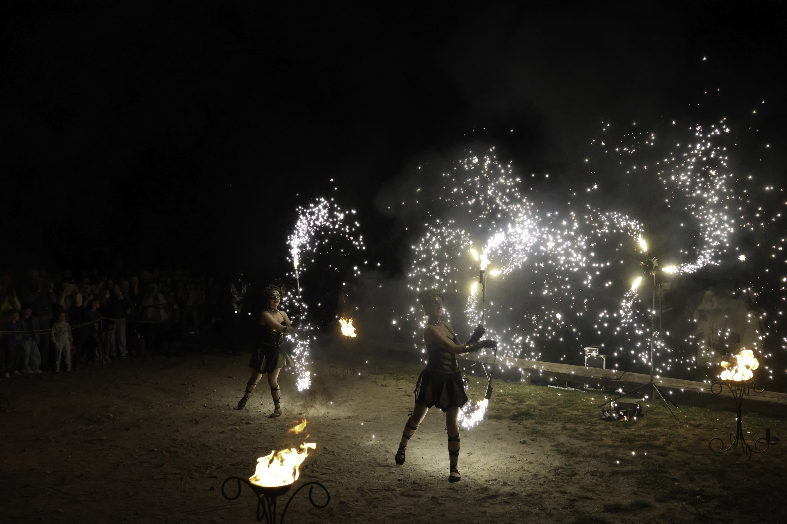 Dvi atlikėjos atlieka ugnies šou su fejerverkais.
