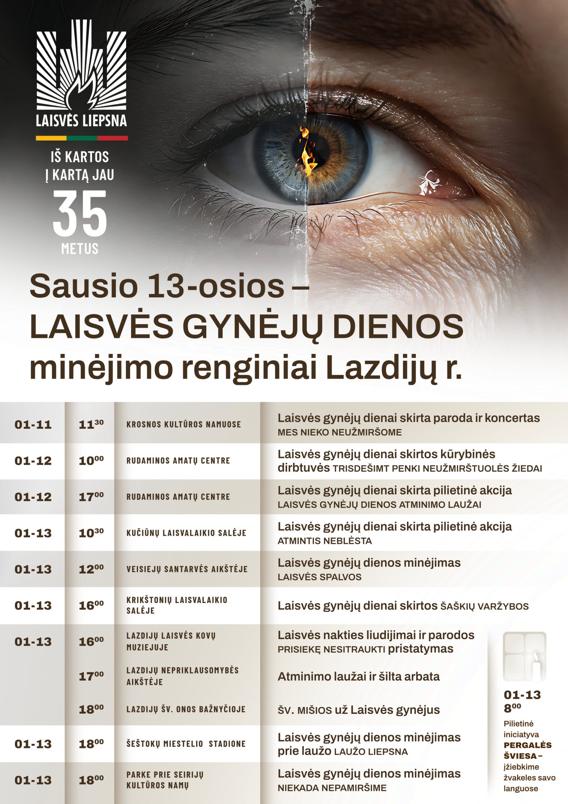 • 01-13 08.00 Pilietinė iniciatyva „Pergalės šviesa“ – įžiebkime žvakeles savo languose
