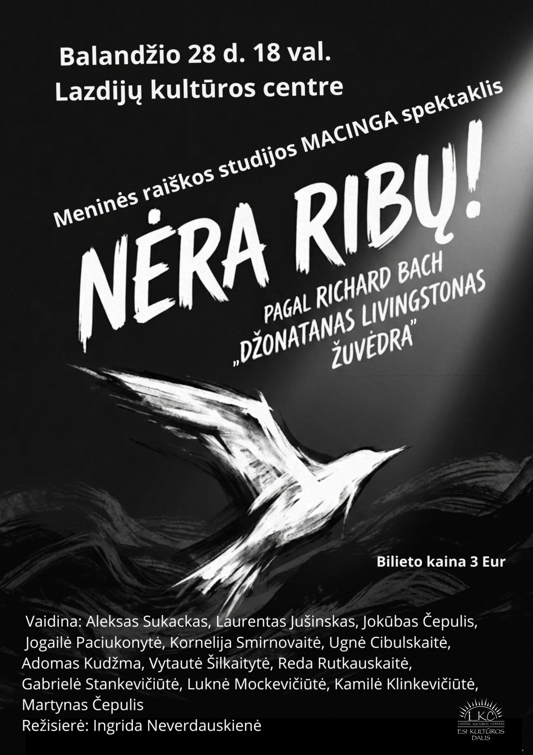 Meninės raiškos studijos „Macinga“ spektaklis „Nėra ribų“, pagal Richard Bach knygą „Džonatanas Livingstonas žuvėdra“. Premjera – balandžio 28 d. 18 val. Lazdijų kultūros centre.