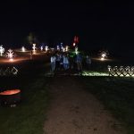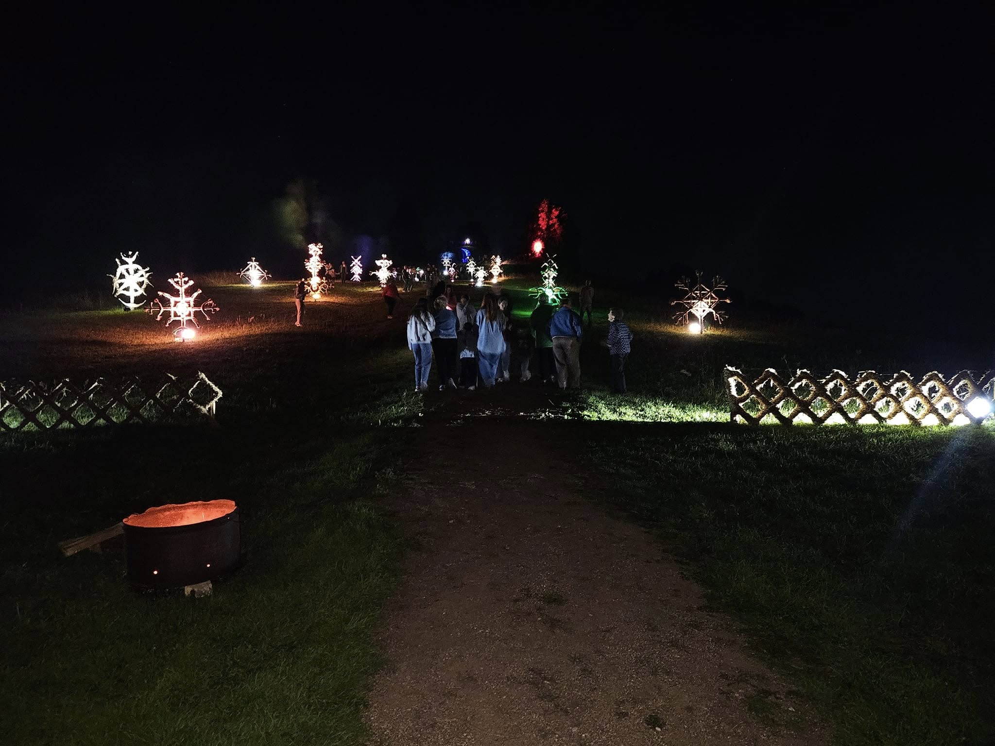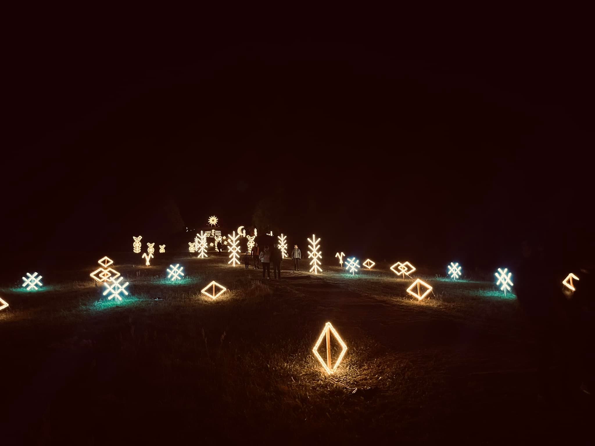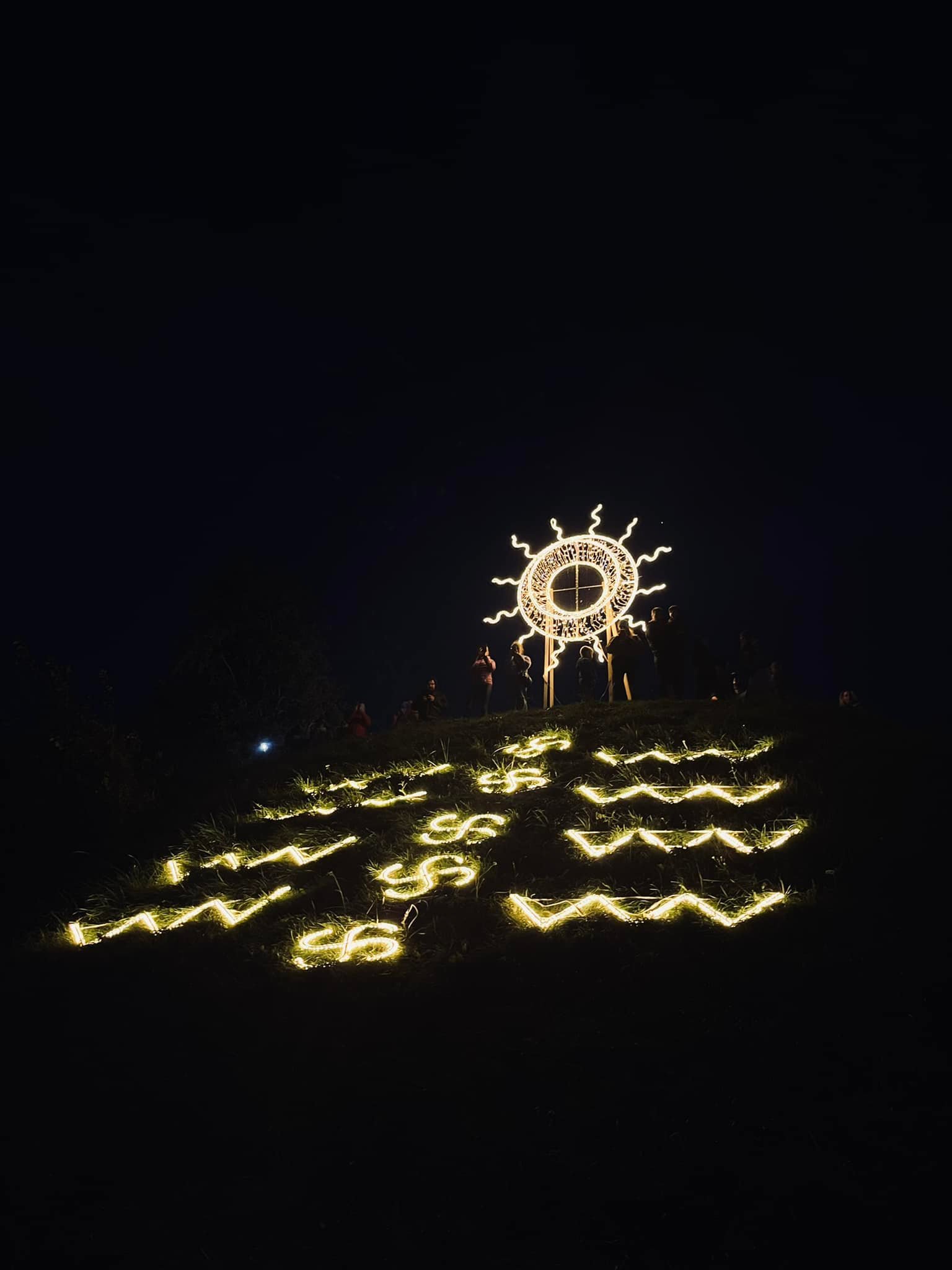 Kalno šlaitas su šviesų instaliacija, vaizduojančia saulę.